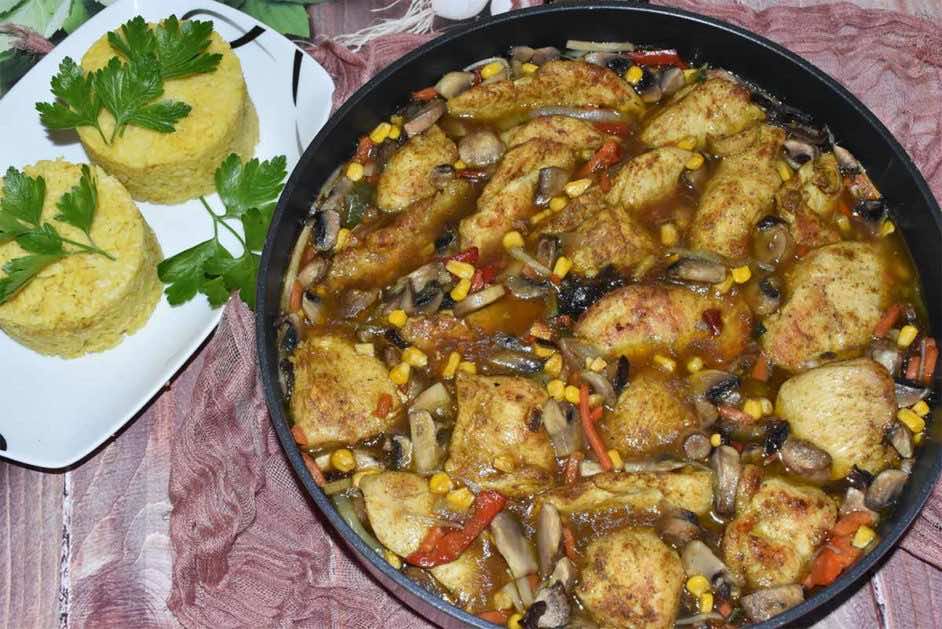 Propozycja na szybki obiadek, filet z kurczaka z mieszanką chińską, podany z ryżem curry.