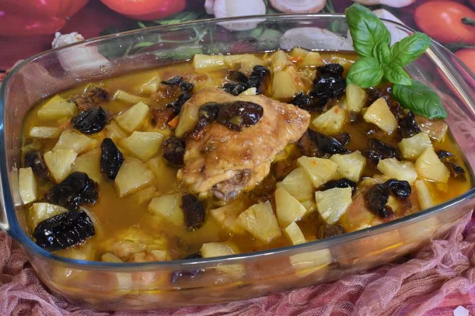 2. Śliwki oraz ananasy kroimy na małe kawałki, wykładamy na mięso.