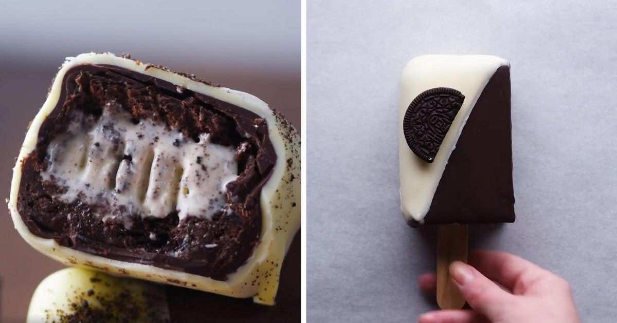 Okruszki wysyp na papierowy ręcznik, a następnie przesyp je do do słoika. Dodaj szklankę gęstej śmietanki powyżej 30% i 50 ml kondensowanego mleka. Słoik zakręć i dobrze nim wstrząśnij. Odstaw go do słodzenia w zamrażarce na 15 minut. Twoje szybkie domowe lody oreo są gotowe. Świetnie smakują gdy włożysz je pomiędzy dwa kawałki ciasta brownie :) Przepis na brownie znajdziecie tutaj. Do środka włóż patyki od lodów, zamocz ciasto najpierw w czarnej, a potem białej czekoladzie. Super deser :)
