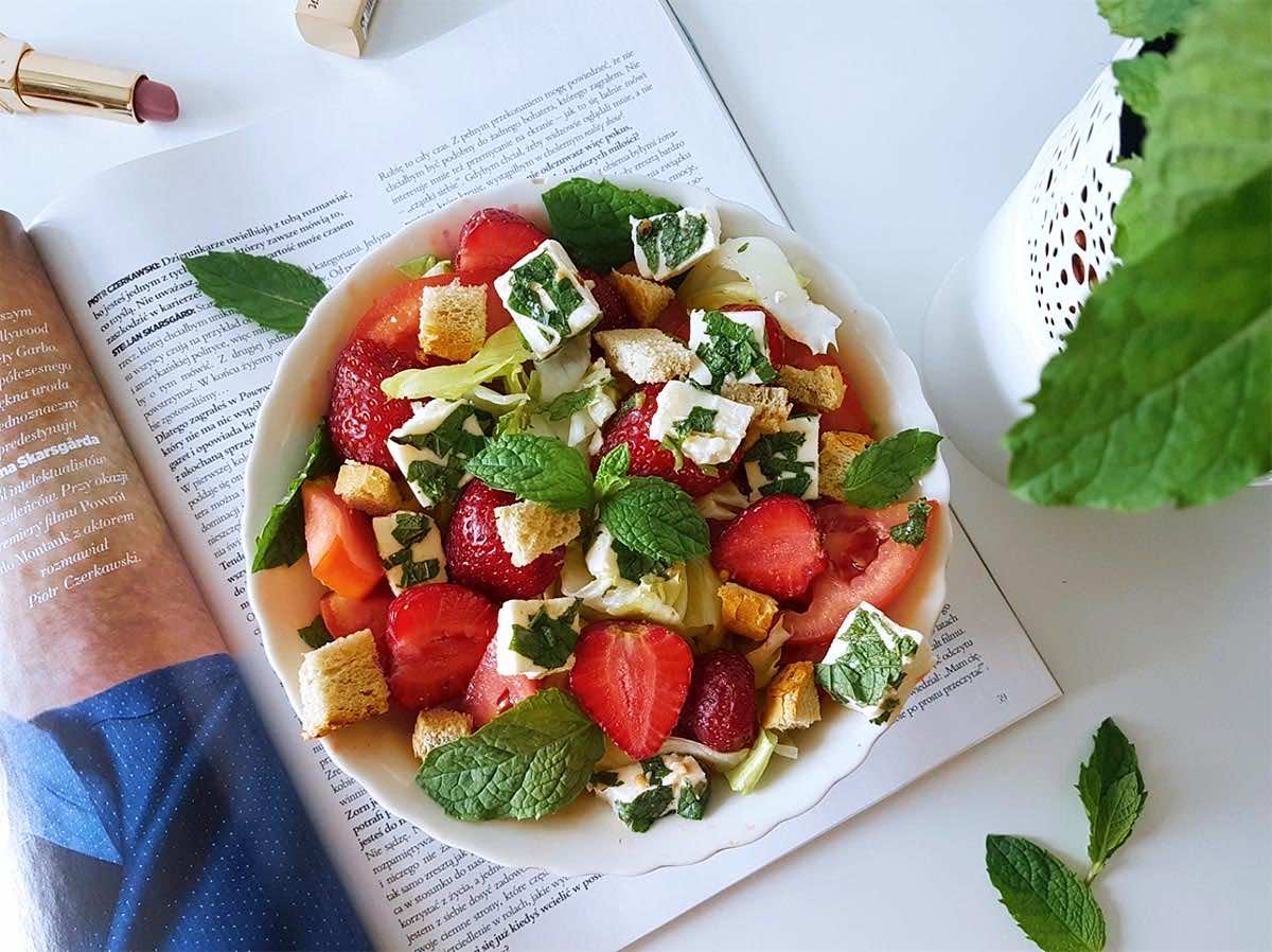 Przepis na doskonałą sałątkę z truskawkami i fetą obtoczoną świeżą miętą z kokosowym sosem.