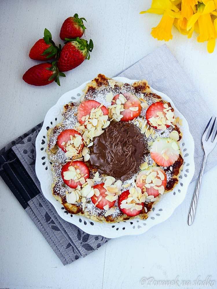 Jest niesamowicie puszysty i bardzo zdrowy, bo nie zawiera białego cukru ani mąki. Podałam go z kremem czekoladowym również bez cukru, truskawkami, prażonymi płatkami migdałów i „cukrem pudrem” z glikozydów stewiolowych. Świetnie sprawdza się jako śniadanie do lunchboxa – na drugi dzień pozostaje świeży i wilgotny. Polecam!