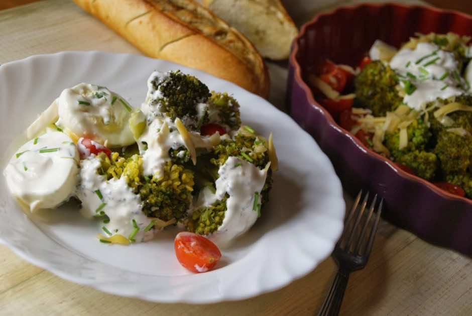 Składniki Brokuł pomidorki koktajlowe 3 jajka 200g jogurtu naturalnego 1 łyżka majonezu Winiary 50 g sera Radamer w kawałku 2…
