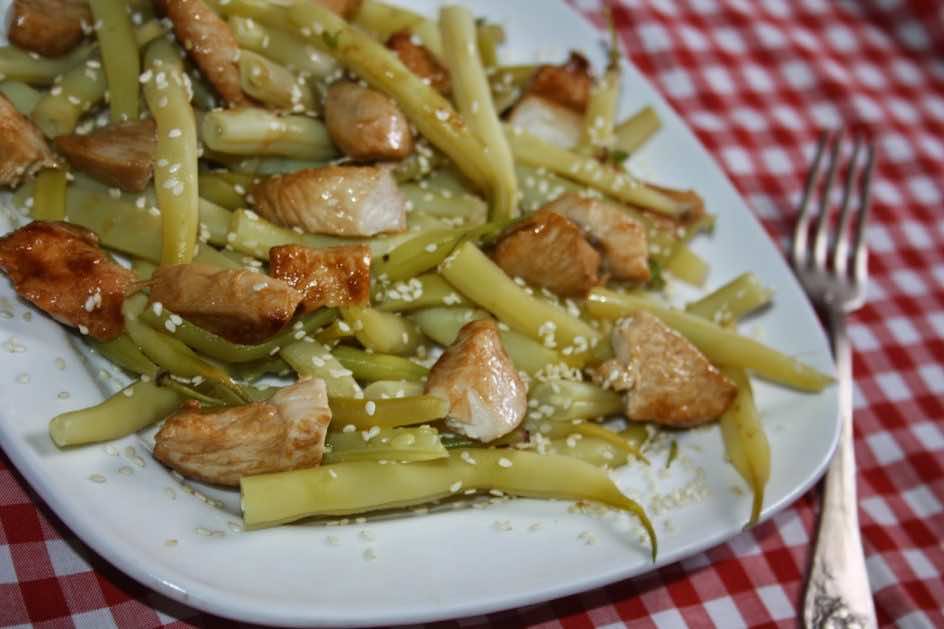 Składniki 300 g piesi z kurczaka 4 łyżki sosu sojowego sól 3 gaście fasolki szparagowej 3 łyżki sezamu olej do…