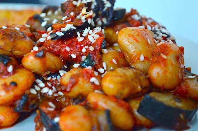 Składniki 1 duża czerwona cebula ząbek czosnku puszka białej fasoli 1 cukinia 3 łyżki ajwaru 2 łyżki białego sezamu pieprz…
