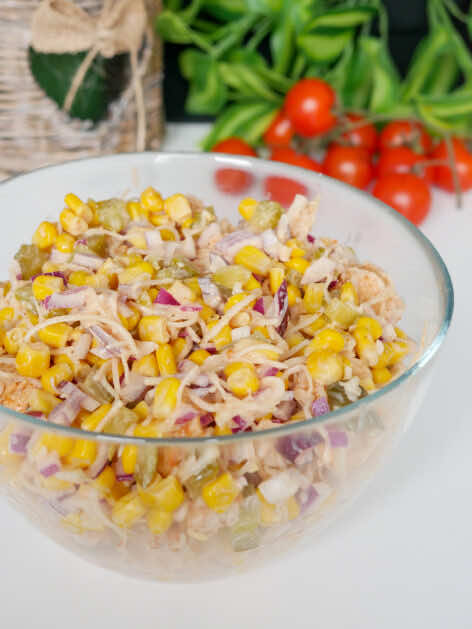 Smaczna i kolorowa sałatka z kurczakiem i selerem konserwowym – pasuje na różne okazje, domowe uroczystości, święta, czy domowe imprezy….
