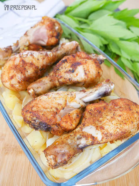 Złociste pałki z kurczaka pieczone na ziemniakach to pyszne danie jednogarnkowe, któremu ciężko się oprzeć.