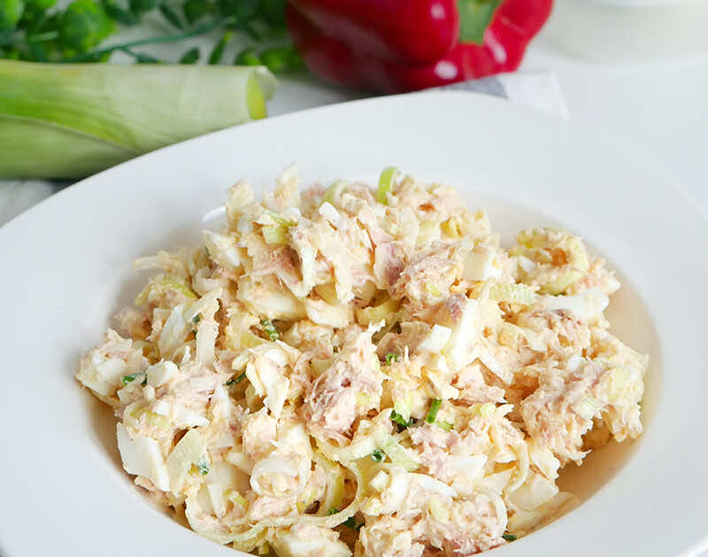 Pasta sałatkowa z dodatkiem tuńczyka, jajek, pora oraz żółtego sera, po wypróbowaniu stanie się jednym z Waszych ulubionych dodatków do pieczywa. Tak było w naszym przypadku, po wykonaniu jej po raz pierwszy pasta bardzo nam posmakowała i robimy ją bardzo często.