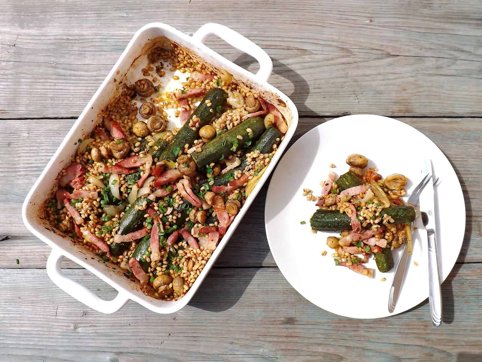 Pęczak z pieczoną cukinią, boczkiem i pieczarkami