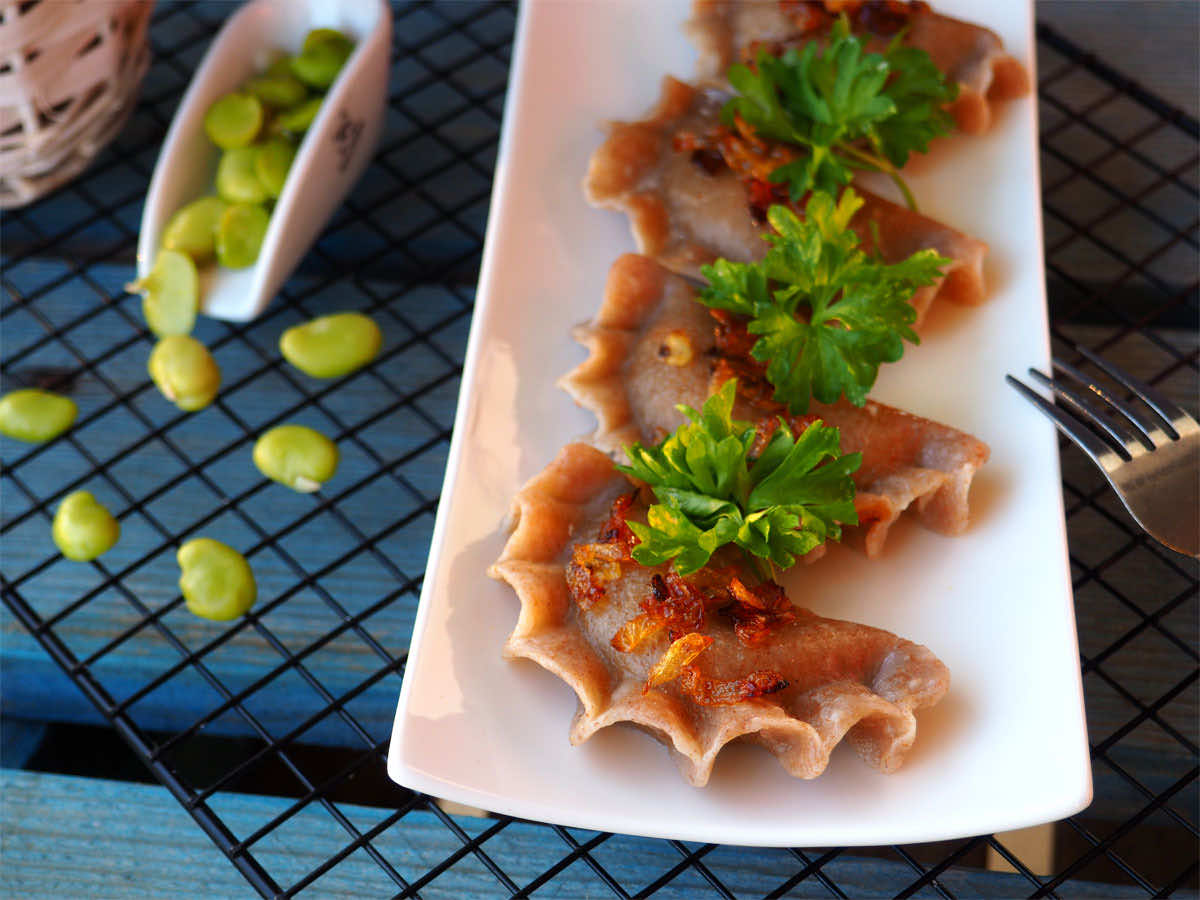 Pierogi w wersji wegetariańskiej z kremowym i delikatnym farszem, wykonane z mąki pełnoziarnistej.