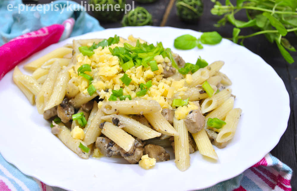 Przepis na pyszny i szybki obiad z makaronem w sosie śmietanowym z pieczarkami i serem żółtym.