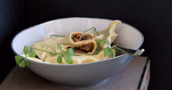 Pierogi z boczniakami i kiszoną kapustą duszoną w cydrze