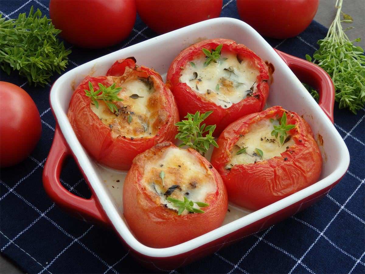 Pomidory i mozzarella to pyszny duet. Świetnie razem smakują na zimno jak i na ciepło. U mnie tym razem wersja na ciepło po prostu pomidory nadziane mozzarellą i zapieczone w piekarniku.