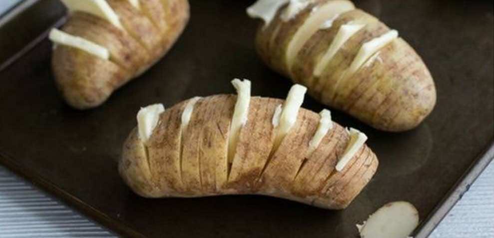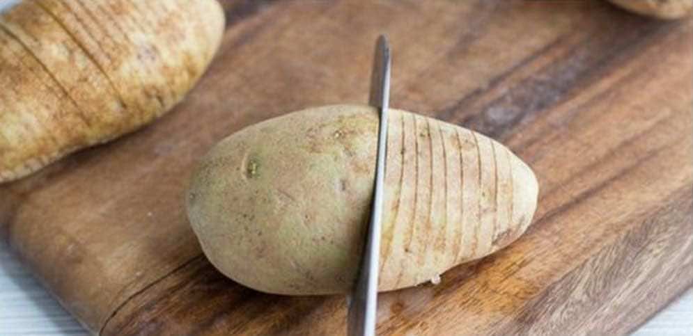 Najlepiej kupić już oczyszczone ziemniaki, a teraz tylko je przemyć pod bieżącą wodą i go lekko podgotuj. Następnie ziemniaka nacinamy, ale nie do końca tak aby się nie rozpadł.