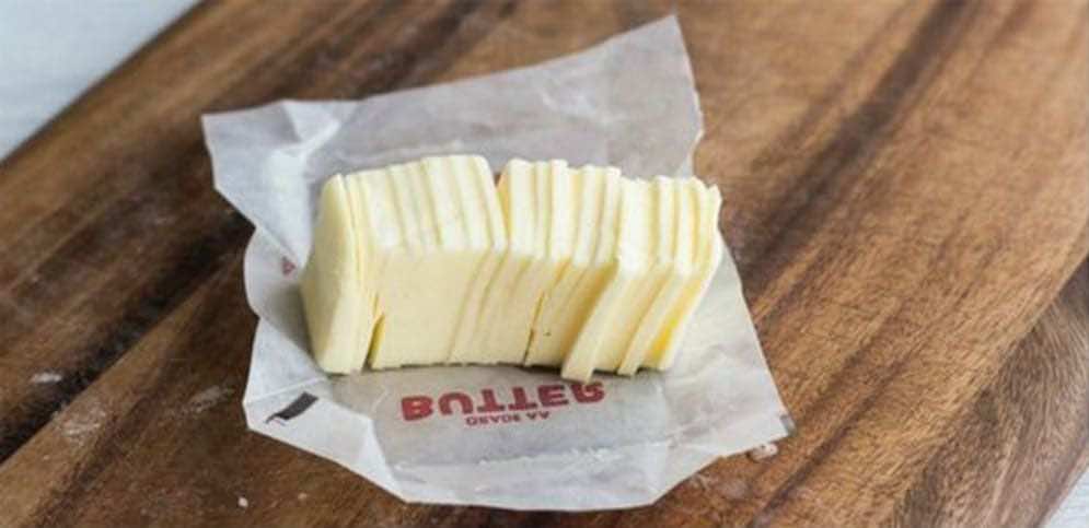 W cienkie plasterki pokrój również masło. Warto wcześniej je umieścić w lodówce aby pokrojenie go było łatwiejsze.