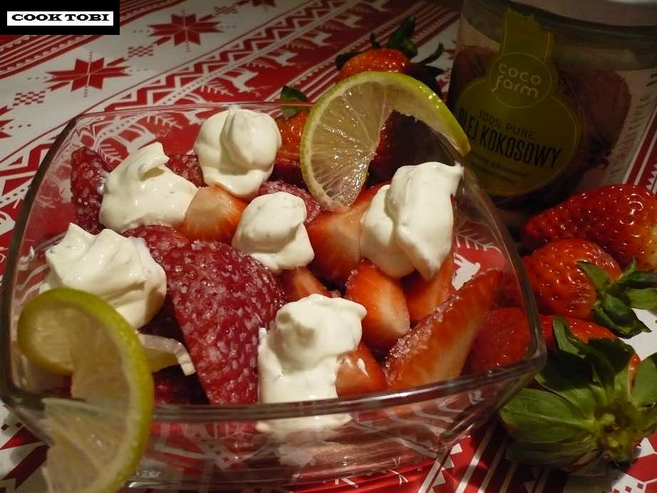 Najprostszy polski deser czyli truskawki ze śmietaną zostanie dziś pomalowany zdrowymi dodatkami które sprawią że bez skrupułów po nie sięgniemy. Dzisiejsza oferta zdrowej żywności jest tak obszerna że wiele potraw można napakować dość obszernie zdrowiem przy okazji podkreślając jeszcze mocniej ich smak. Do truskawek dodamy prozdrowotny olej kokosowy, ksylitol, limonkę i mięte, będzie to mocno witaminowy zastrzyk w sam raz na początek wiosny. Cukier brzozowy w smaku przypomina cukier lecz jest bardziej delikatny a gdy go jemy czujemy jakbyśmy jedli zmrożony cukier. Bardzo polecam wersję prozdrowotną truskawek dzieciom gdyż cukier brzozowy świetnie chroni zęby. Również olej kokosowy ma właściwości chroniące zęby!. Zapraszam do wypróbowania!