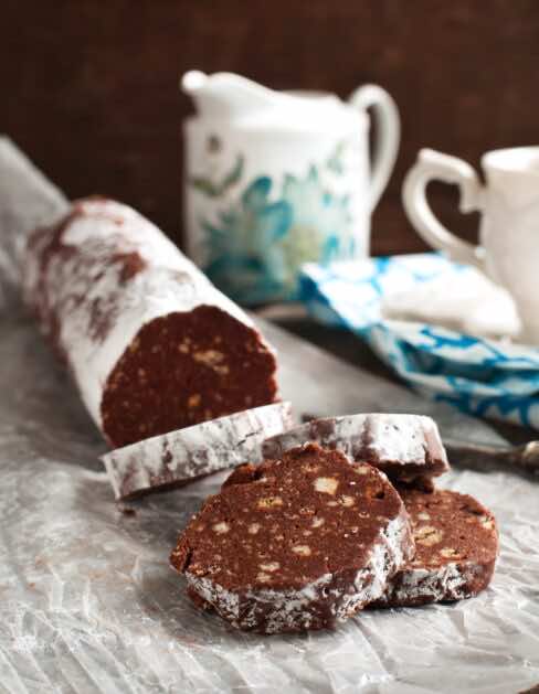 5. Przełóż masę na papier do pieczenia i uformuj w kształt salami, zwijając papier do pieczenia wokół masy, aby nadać jej kształtu.