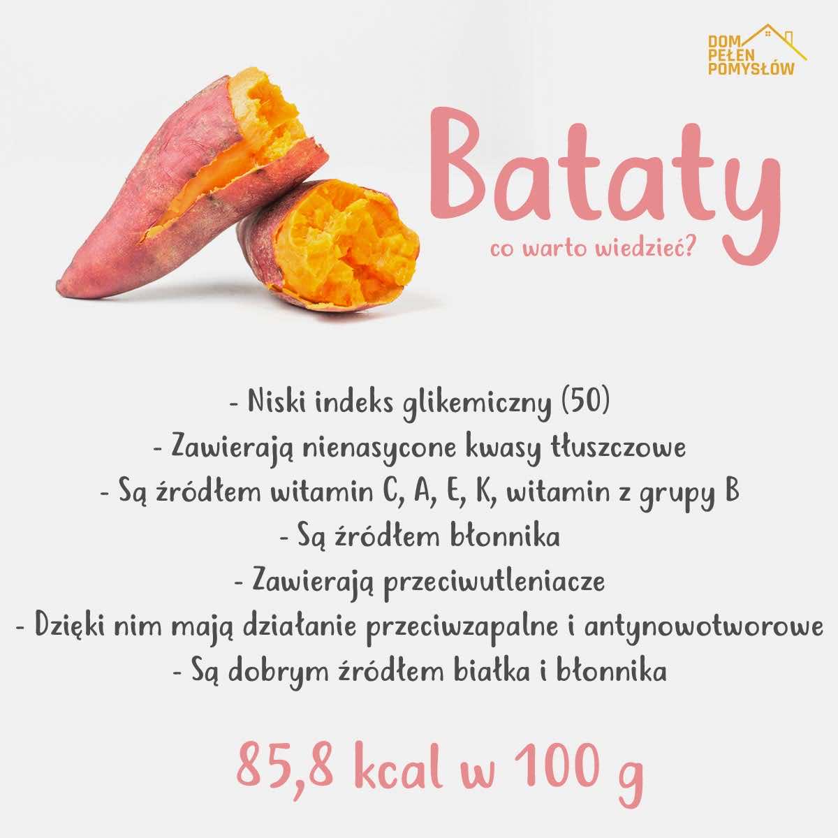 Bataty mogą być wam znane pod nazwą słodkie ziemniaki, ale zapewne nie słyszeliście nazwy wilec ziemniaczany? Jest to rodzaj byliny i właśnie jej część podziemną w postaci bulwy zjadamy. Słodkie ziemniaki są bogate w węglowodany złożone (na tych nam zależy) i błonnik. To również cenne źródło mikroelementów oraz witamin. Znajdziemy w nich witaminę A, C oraz witaminy z grupy B. Są także źródłem beta-karotenu i polifenoli – to naturalne przeciwutleniacze. Do tego mają niski indeks glikemiczny (50) dlatego są zalecane osobom, które się odchudzają. Energia, której dostarczają uwalniana jest stopniowa i rozłożona w czasie. Poziom cukru we krwi po ich zjedzeniu nie wzrasta drastycznie jak w przypadku zjedzenia zwykłych chipsów. To sprawia, że nadmiar nie jest odkładany w postaci tkanki tłuszczowej.