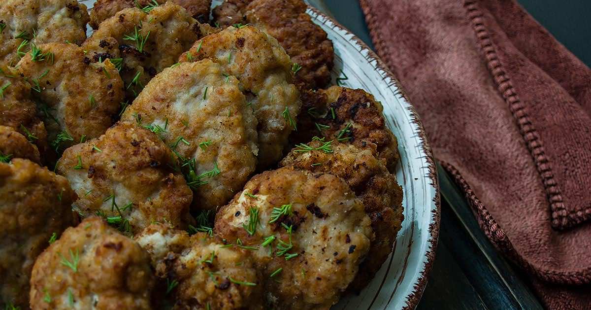 Uformowane kotlety smażymy na patelni do zarumienienia z obydwu stron. Dolewamy trochę wrzątku, zmniejszamy gaz i dusimy jeszcze kilka minut, aż woda odparuje. Nasze kotleciki są już gotowe. Na koniec posypujemy je na talerzu posiekanym koperkiem.