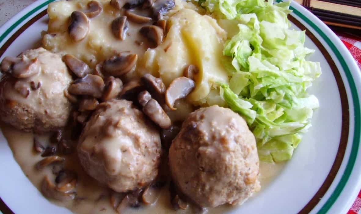 Pulpety z indyka w sosie pieczarkowo serkowym.