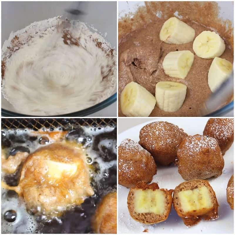 - Kawałki banana zamocz w cieście i wrzuć na głęboki olej do smażenia