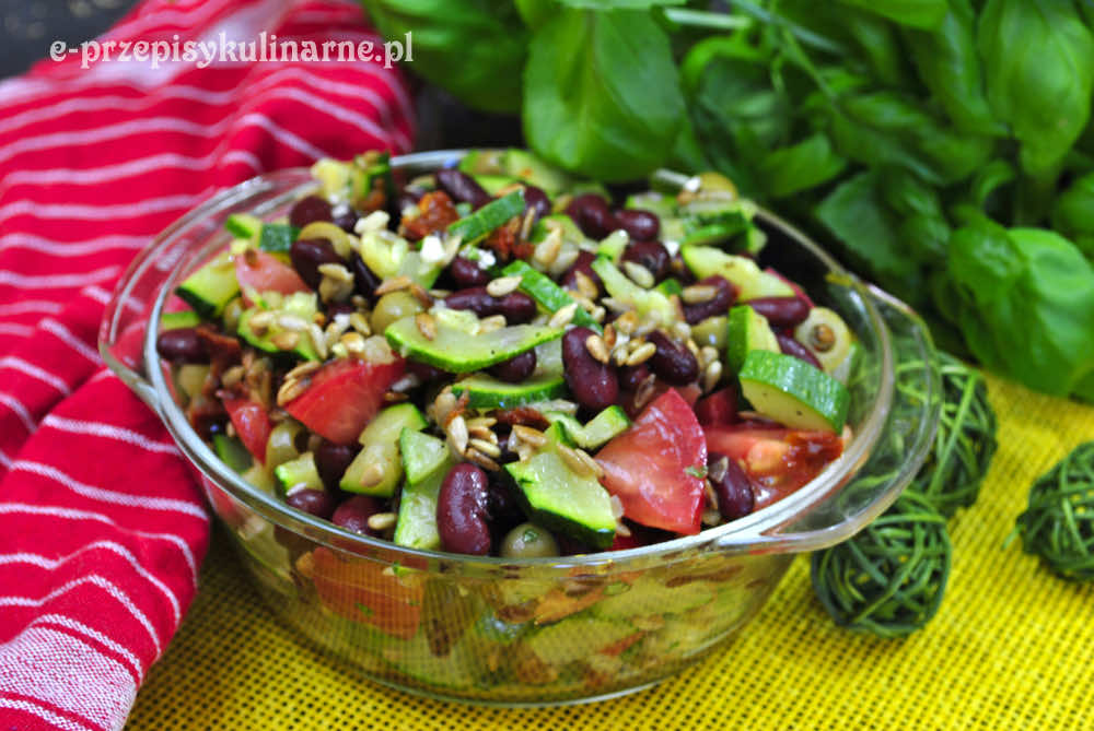 Polecam przepis na smaczną sałatkę z młodą cukinią, pomidorami i fasolą czerwoną. Świetnie sprawdzi się jako dodatek do mięsa albo samodzielne danie. 100 g sałatki to 90 kcal.