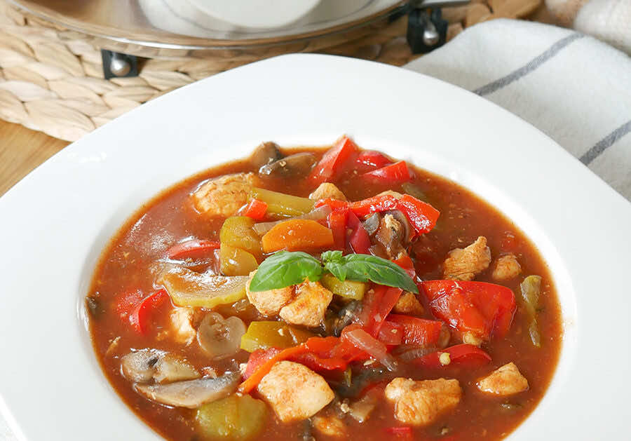 Zupa gulaszowa na bazie warzyw i mięsa drobiowego. Idealny pomysł na pyszny rodzinny obiad.