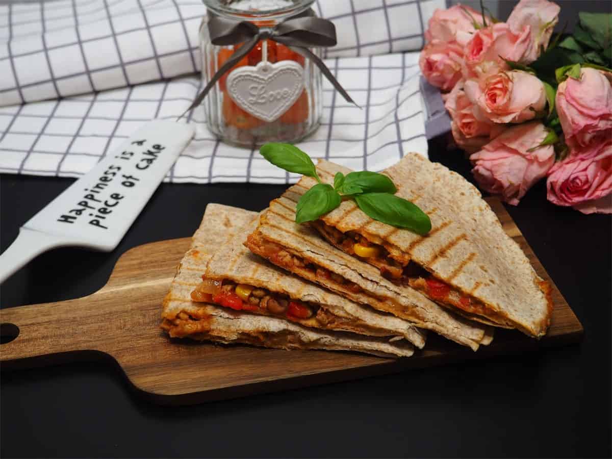 Quesadilla z wołowym mięsem mielonym oraz dodatkami w stylu meksykańskim, tj. papryką, czerwoną fasolą, kukurydzą i pomidorami.