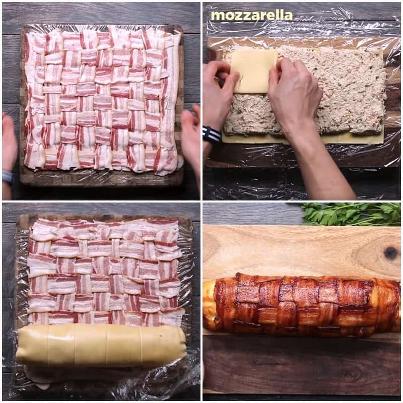 - Bekon rozłóż na folii spożywczej „na zakładkę jak plecionka do kosza”