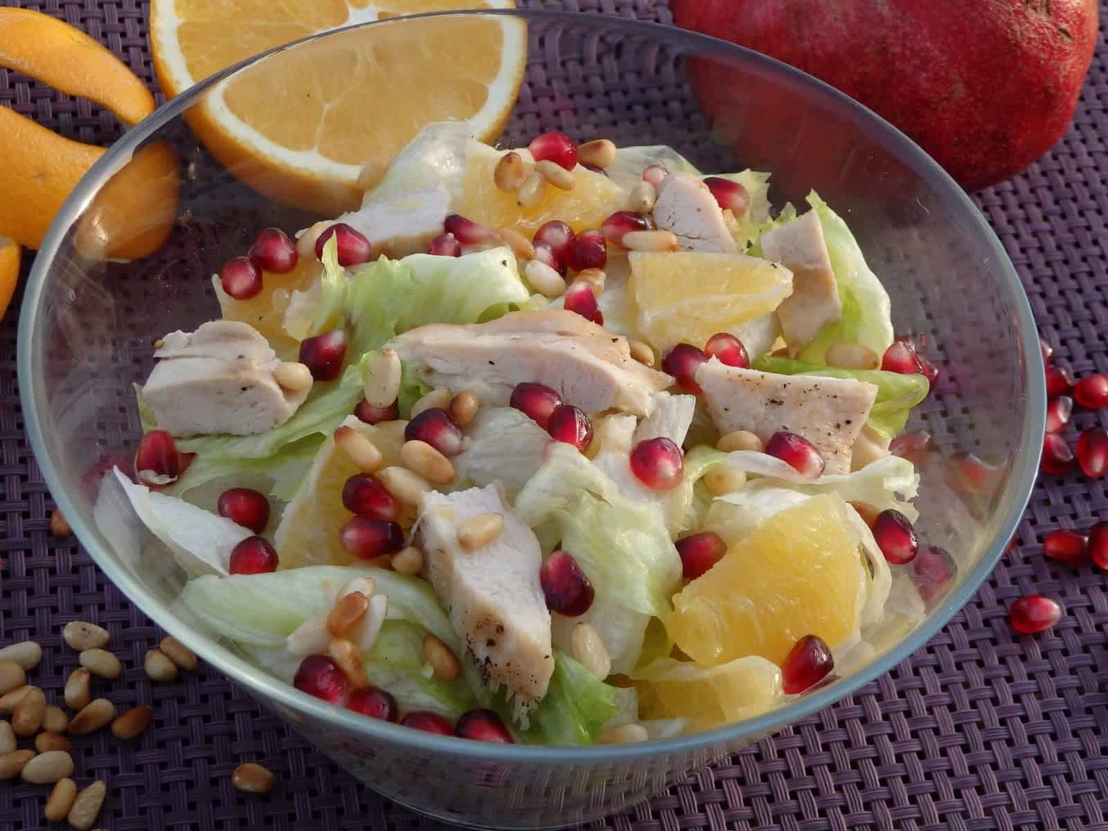 Kolejna pyszna i kolorowa sałatka. Tym razem połączyłam grillowanego kurczaka z granatem i pomarańczą. Trochę koloru na talerzu przyda się w ten pochmurny dzień.