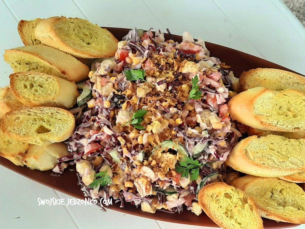 Uwielbiam kebaby i dlatego postanowiłam zrobić tą sałatkę,wyszła genialna! Wymieszałam ze sobą wszystko co w kebabie lubię najbardziej, wymieszałam z czosnkowym sosem i do tego zamiast bułki czosnkowe grzanki – mniam!  Fajnie wygląda i do tego pysznie smakuje – sprawdzi się super na każdej imprezie, lub po prostu na kolację czy lunch. Polecam.