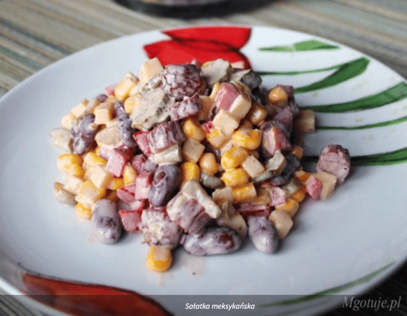 Pyszna sałatka meksykańska z dodatkiem kabanosa. Pasuje na wszelkiego rodzaju imprezy. Polecam