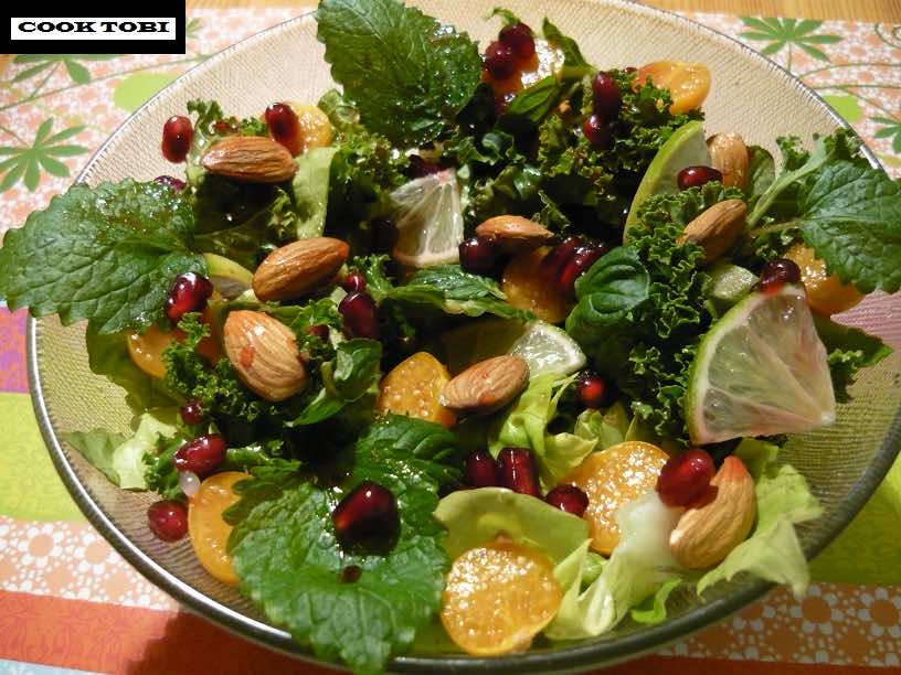 Witajcie! Orzeźwienie w środku zimy? Czemu nie!. Jeśli czujesz że czas zjeść coś lekkiego, zdrowego a zarazem uderzającego świeżością – spróbuj mojej sałatki :). Sałata masłowa, jarmuż, mięta, melisa, limonka, granat i chrupiące migdały! wszystko to osłodzimy prozdrowotnym ksylitolem :). Żadnej oliwy, żadnego oleju = minimum kalorii, przy zachowaniu maksimum smaku. Gdy połączycie sok z limonki i granata z ksylitolem uzyskacie bardzo wyrazisty dressing :)
