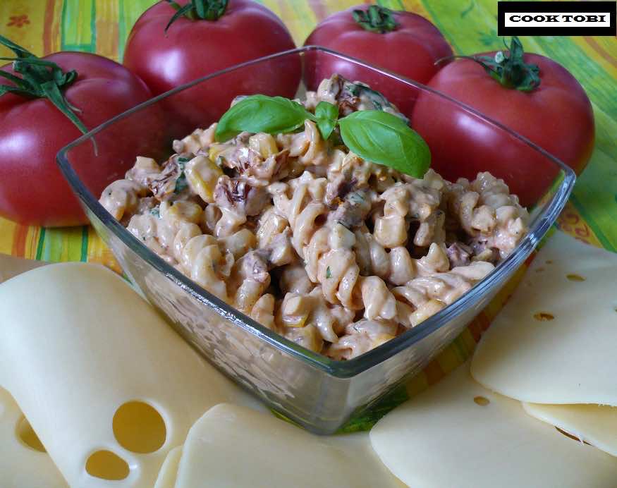 Okres majowy od kilkunastu lat nieodłącznie kojarzy się z grillem czy ogniskiem. Sałatka serowo – pomidorowa z odświeżającą bazylią jest idealnym dodatkiem zarówno by zabrać ją do pojemnika w plener jak i świetnie się sprawdzi podczas imprez czy bankietów w domu. Użyjemy świeżej bazylii, suszonych pomidorów i 2 typów sera: z dziurami i wędzonego. Zamiast zwykłego makaronu polecam użyć 5 jajecznego – jego smak nie jest jałowy i nie pozbawia smaku sałatki. Polecam zapisać sobie przepis do ulubionych ponieważ uniwersalność tej sałatki pozwala wykorzystać ją przez cały rok. Zapraszam do wypróbowania!