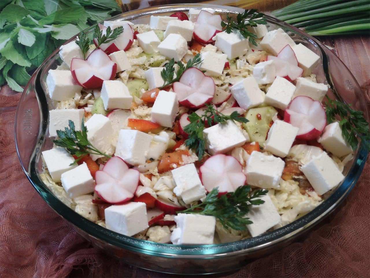 - Następnie dodajemy pokroje w pół plasterki rzodkiewki, w paski paprykę, ogórka obrane w pół plasterki oraz pomidora pokrojonego w kostkę