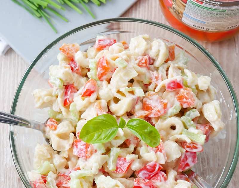 Pyszna sałatka z 3 składników z dodatkiem sosu na bazie jogurtu naturalnego i majonezu. Do jej przygotowania potrzebujemy pierożków tortellini, chrupiącej papryki i selera.