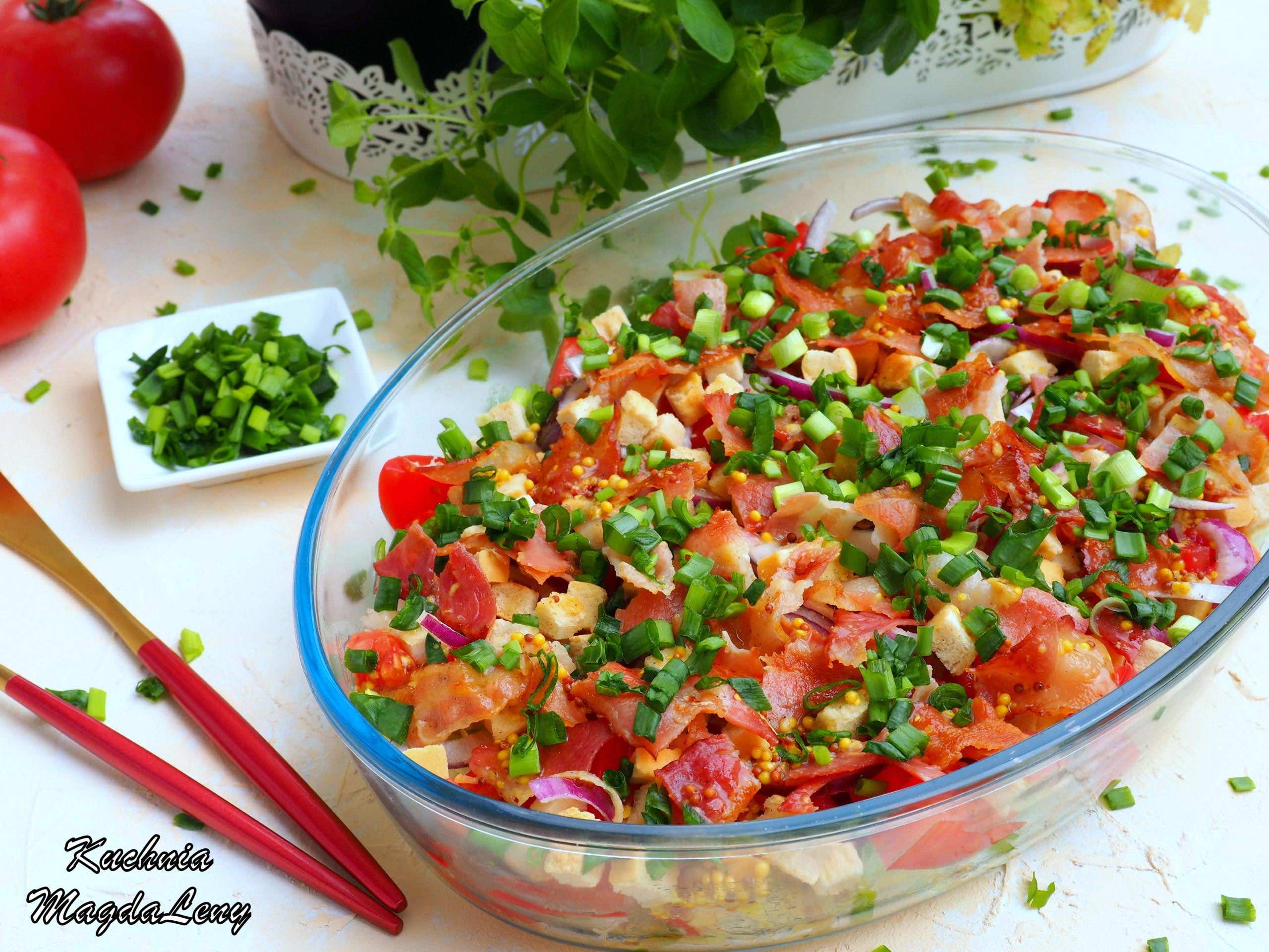 Pyszna sałatka z chrupiącym boczkiem i grzankami, podana z sosem musztardowym.
