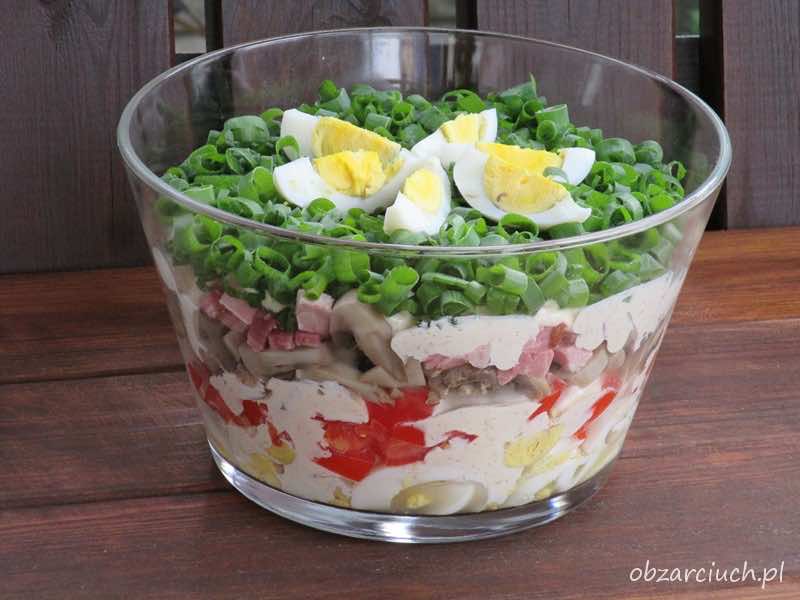 Szybka w przygotowaniu sałatka z szynką, pieczarkami, jajkami i sosem musztardowym, super propozycja na kolację.