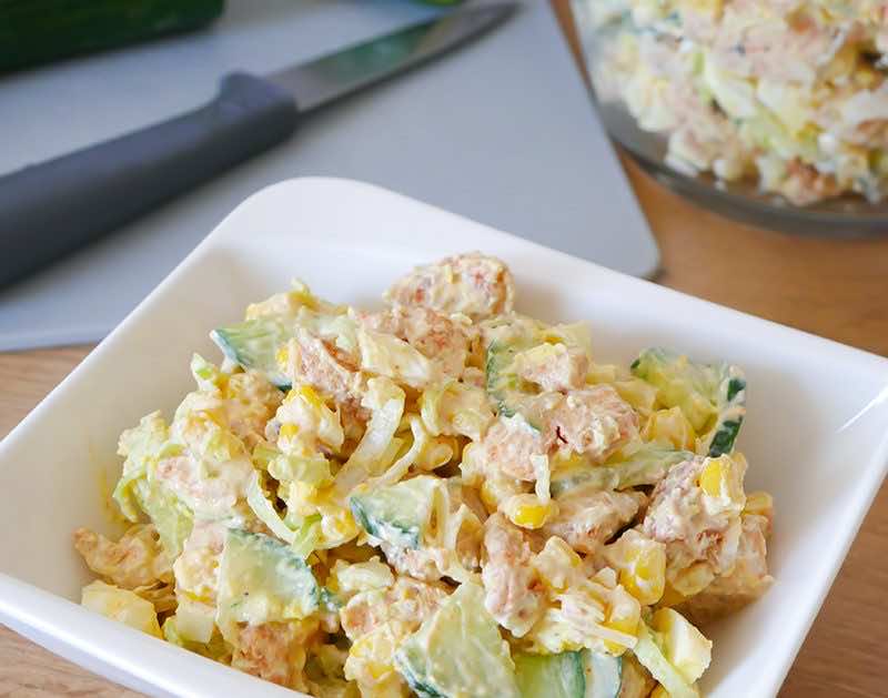 Kolorowa i smakowita sałatka z kurczakiem i świeżym ogórkiem. Dodatek soczystego kurczaka w przyprawach sprawia, że sałatka ma wyrazisty smak, a świeże warzywa czynią ją jeszcze smaczniejszą!