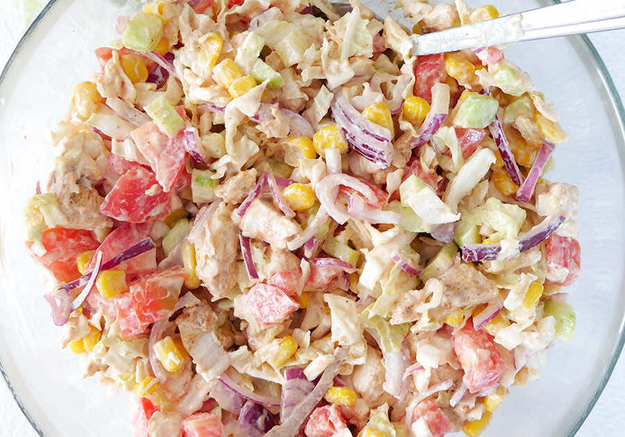 Sałatka z kurczakiem i pysznym sosem. Bardzo fajna zarówno na co dzień jak i jako poczęstunek dla gości.