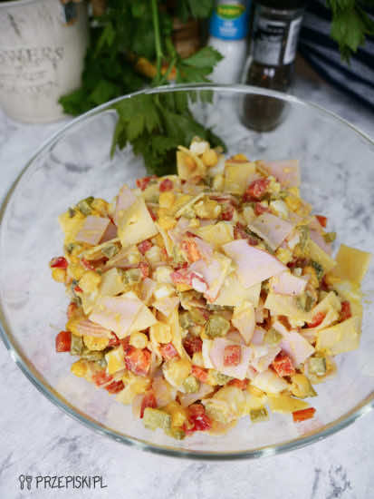 Sałatka z szynką i serem w plastrach to bardzo łatwa i szybka do zrobienia sałatka. Można zaserwować ją na kolację, obiad, czy rodzinną imprezę.