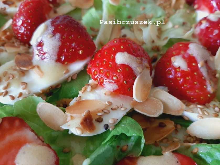 Delikatna i bardzo smaczna sałatka z truskawek i mozzarelli z oryginalnym sosem i dodatkiem prażonych migdałów oraz sezamu. Doskonała na śniadanie lub lekką kolację w upalne dni.