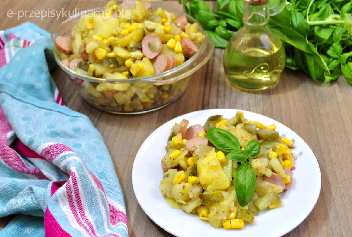 Przepis na smaczną i tanią sałatkę z ziemniakami, ogórkami małosolnymi i parówkami.