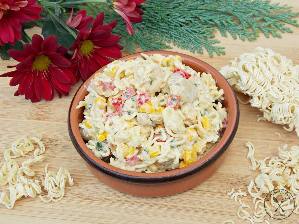 Nie będę Was czarować, że sałatka jest pyszna i bardzo mi smakuje. Najzwyczajniej nie przypadła do gustu mnie jak i mojej drugiej połowie. Wyczuwam ten charakterystyczny, chemiczny posmak – no cóż, na co dzień staram się unikać takiej żywności. Mój syn za to przepada za nią i czasem jestem przymuszona do zrobienia jej tylko dla niego. Faktem jest, że sałatka jest bardzo prosta w przygotowaniu i ma swoich wielbicieli.