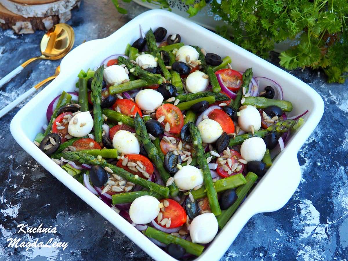 Fit sałatka z dodatkiem zielonych szparagów oraz mozzarelli.