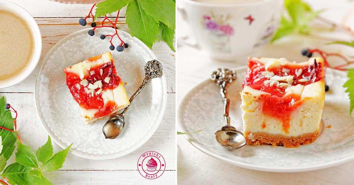 Pyszny, kremowy sernik na spodzie z ciasteczek oraz z musem z pieczonych śliwek.
