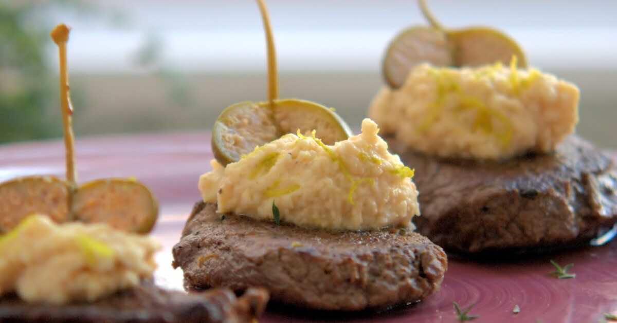 Serowo-limonkowe puree z selera, kremowe, puszyste. Soczysta, polska wołowina smażona z czosnkiem i macierzanką, oraz słony kapar, jak wisienka na torcie. Danie przyjemnie połechce Wasze kubki smakowe.