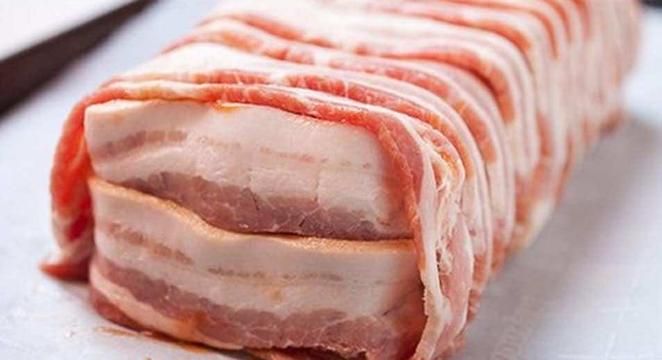 Teraz boczek zawiń do środka i przełóż mięso na blachę oraz dokładnie z każdej strony otul je boczkiem.