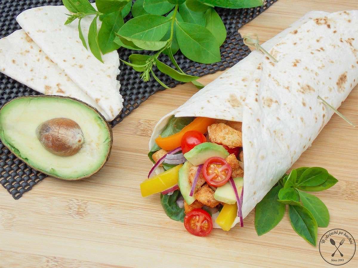 Do maślanki dodajemy majonez, śmietanę, sok z cytryny oraz przeciśnięty przez praskę czosnek. Dodajemy posiekane zioła i mieszamy do połączenia się składników. Doprawiamy do smaku przyprawami. Na suchej i rozgrzanej patelni podgrzewamy placki tortilli. Na każdym placku układamy liść sałaty, wykładamy porcję warzyw i kurczaka. Polewamy przygotowanym wcześniej sosem i zwijamy. Podajemy od razu po przygotowaniu.