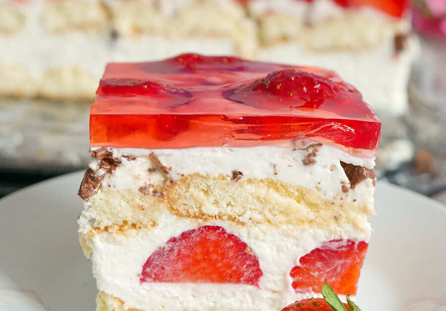 Pyszne i lekkie ciasto bez pieczenia z truskawkami. Idealne do popołudniowej kawy.