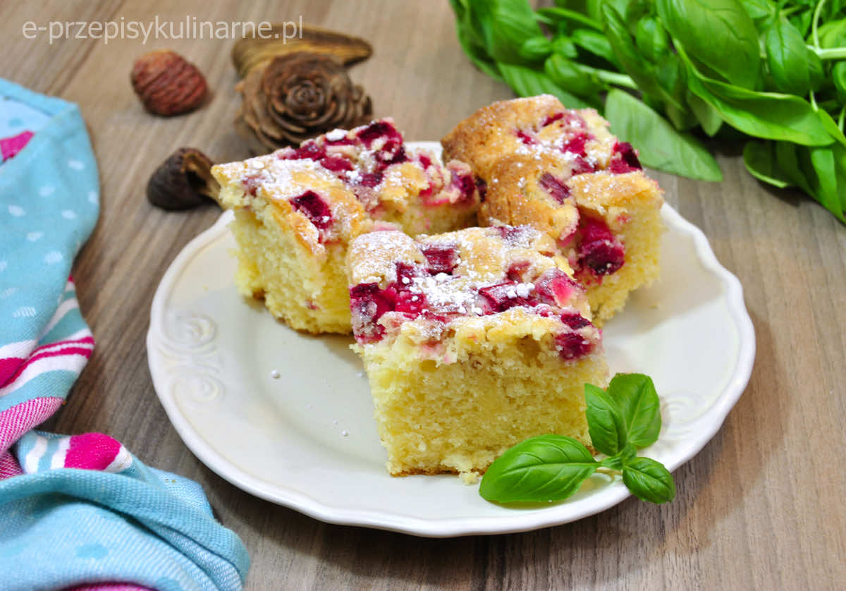 Przepis na smaczne ciasto z owocami, które robi się błyskawicznie. Ja dałam rabarbar, ale mogą to być inne owoce – jabłka, truskawki, wiśnie, itd.